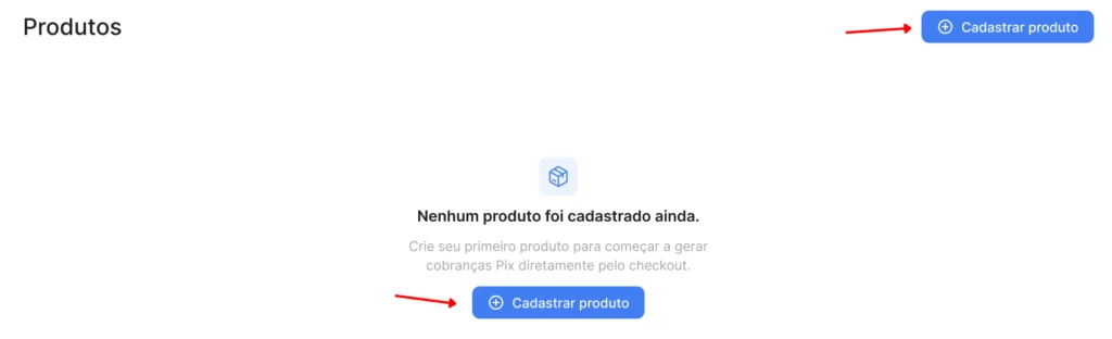 Na próxima tela, clique em Criar produto no canto superior direito ou no botão centralizado.