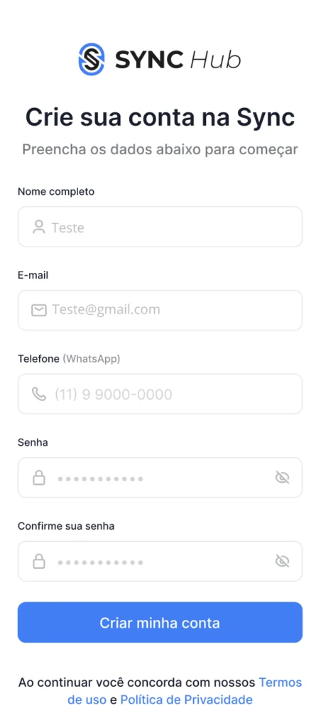 - Preencha todos os campos com os seus dados e clique em “Criar minha conta”.