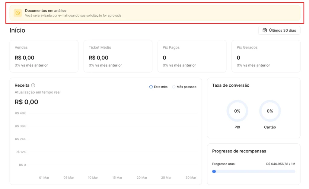 Após enviar tudo que foi solicitado, você será redirecionado novamente para o dashboard inicial onde poderá ver uma notificação de “Documentos em análise” na parte superior.